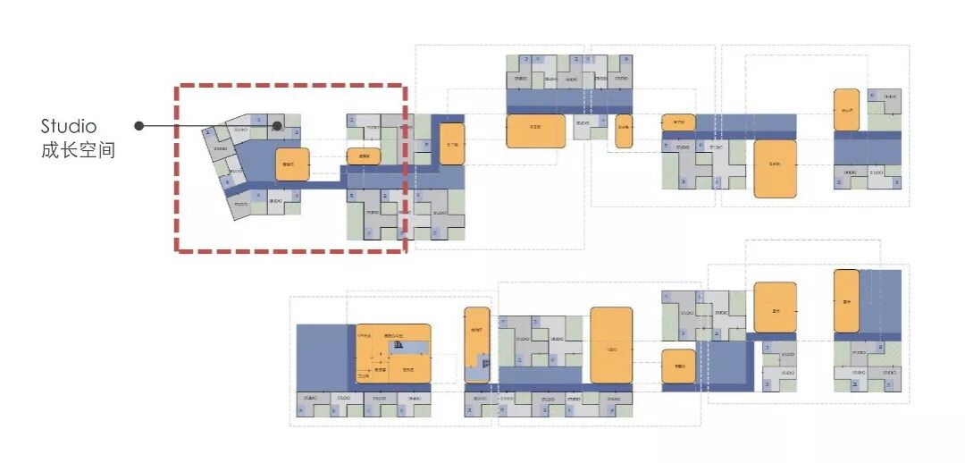 • 第4个举措是通过引入许多嵌入在配套组团里的“studio”模块,为未来功能的生长留出可能性。 此外,配套建筑部分的设计似乎是一个不断处理局部跟局部之间关系的过程,这种有别于整体视角的设计方式让整个设计过程充满了惊喜,这也许更接近聚落成长的本质吧。