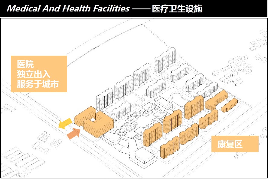 2. 如何实现医疗地块建筑“看不见、享得到”,对养老住区提供充分支持;