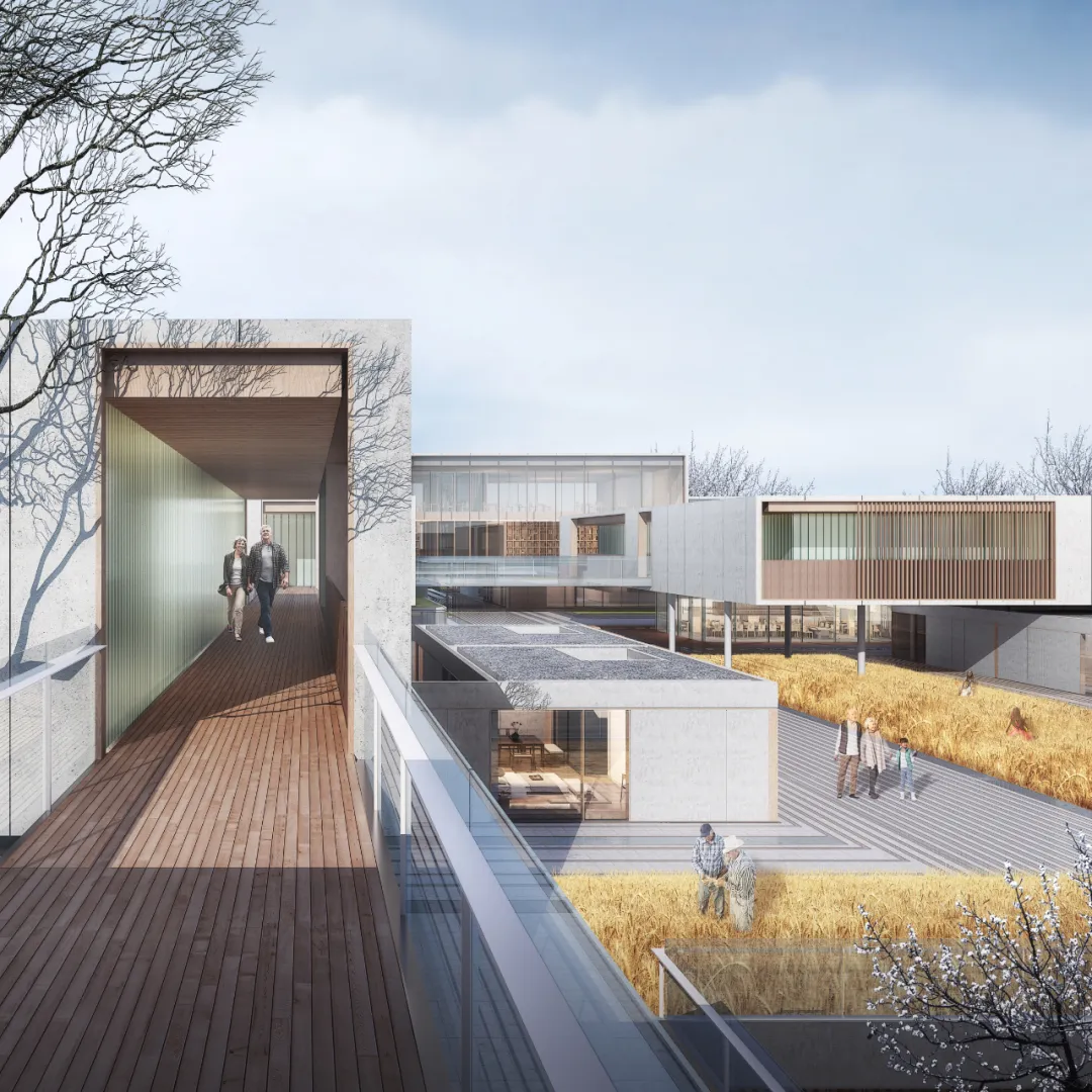 小镇中心作为社区的特色配套和聚落空间的集中体现,主要为客户的“朋友圈”“家庭圈”提供社交、聚会空间,前期可以作为示范区及接待客厅使用。主要涵盖一些“前街后坊”的空间,如国学馆、智慧坊、亲子坊、手工坊、书画坊、音乐坊等学习休闲场所。它们聚成几个组团,每个都有向外的展示面和出入口;同时,拥有面向内院的工作生活区。在设想中,老人们可以选择租赁其中的一些工作室“对外营业”,从而“复活”他们的专业技能和兴趣爱好。