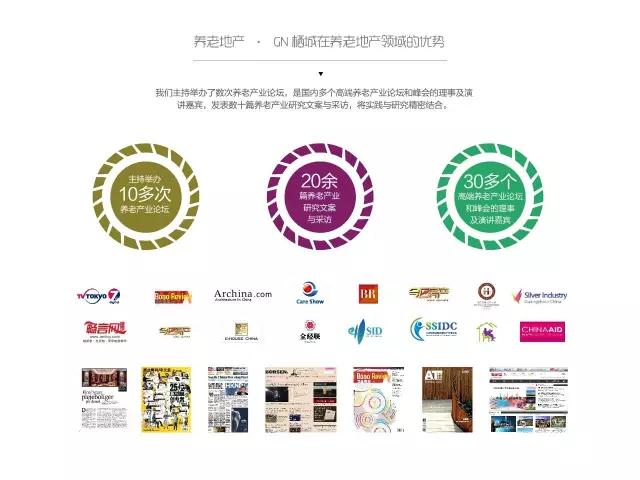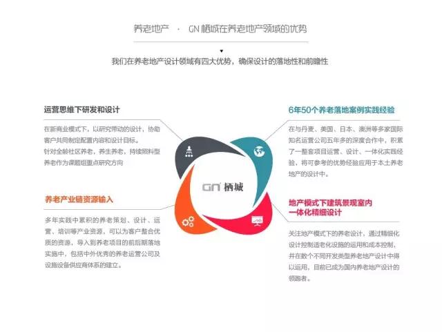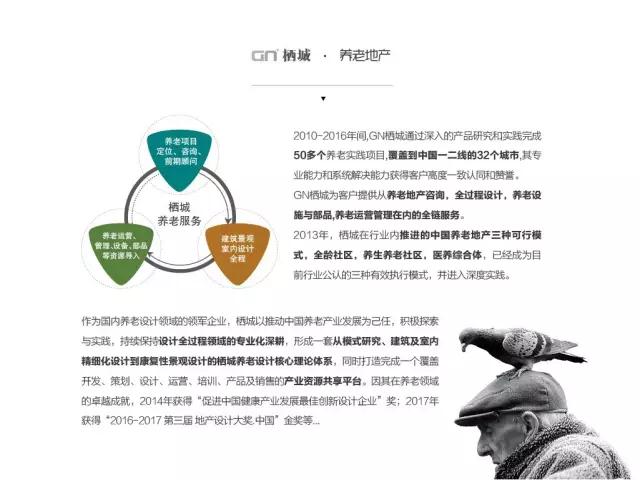 GN栖城从2010年起,在适老化设计与通用设计领域积累了丰富的实战经验,近7年完成50多个适老化建设项目;为中国一线的房地产商,险资,国企和央企等进入养老产业提供全链服务。主要作品(养老住宅及医疗类)有:万科随园嘉树护理院、上海金山颐和苑老年社区、银城南京紫金山养老项目、保集富椿佘山养生养老社区、绿地长岛养老项目、中信国安第一城养老项目、海南儋州海阳城老年社区、保利银滩养老公寓等知名养老项目。
