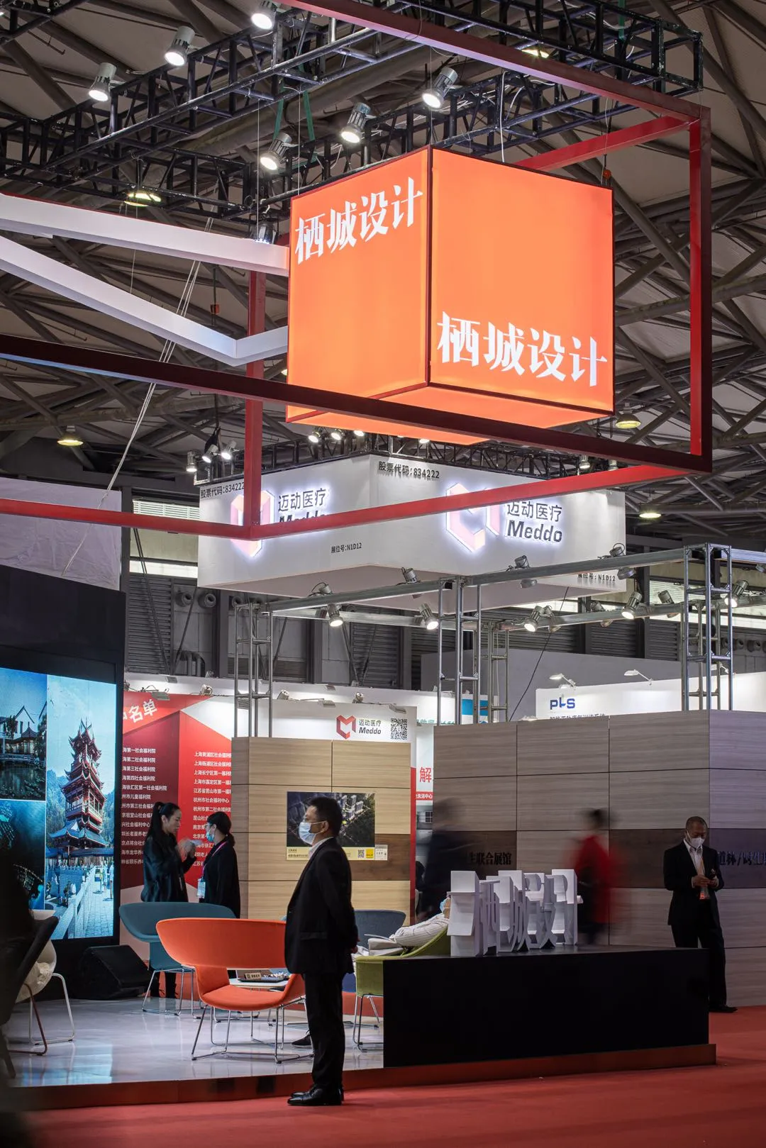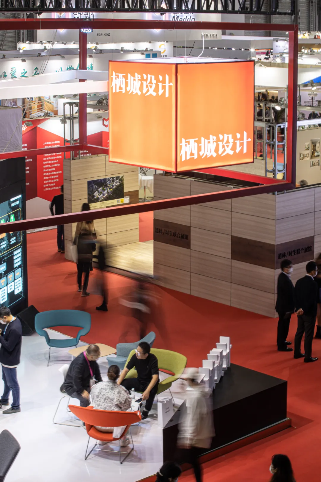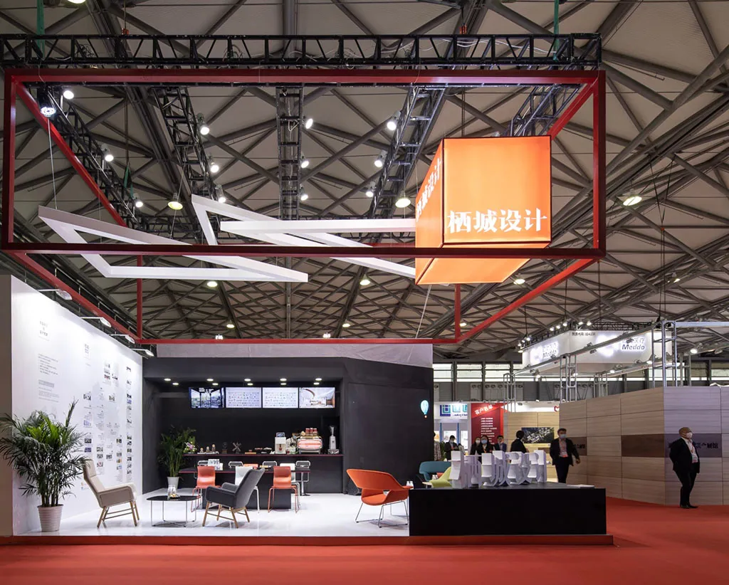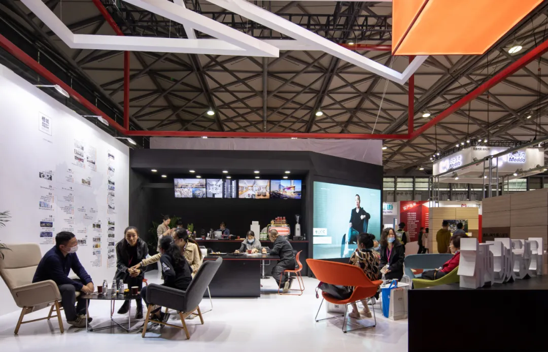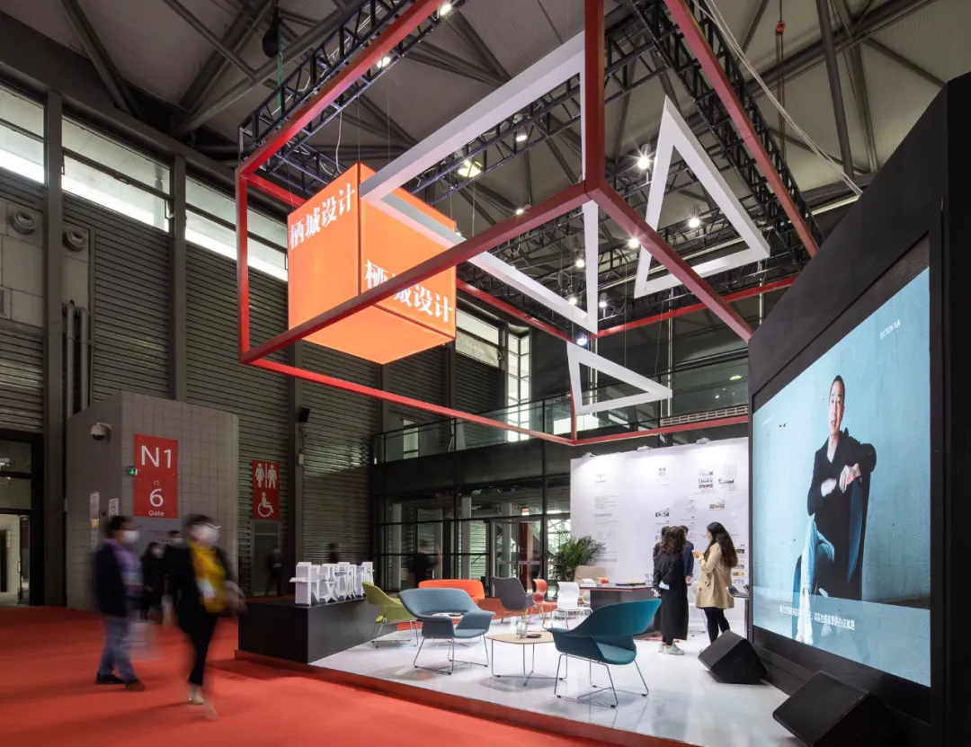 为了让这个特别的展位能最大可能的提供“舒适”的体验,栖城携手来自芬兰的家居设计品牌AVARTE(阿旺特),现场布置多彩的家具,与展位红白黑的配色相结合,在素色的会场里显得特别温和。